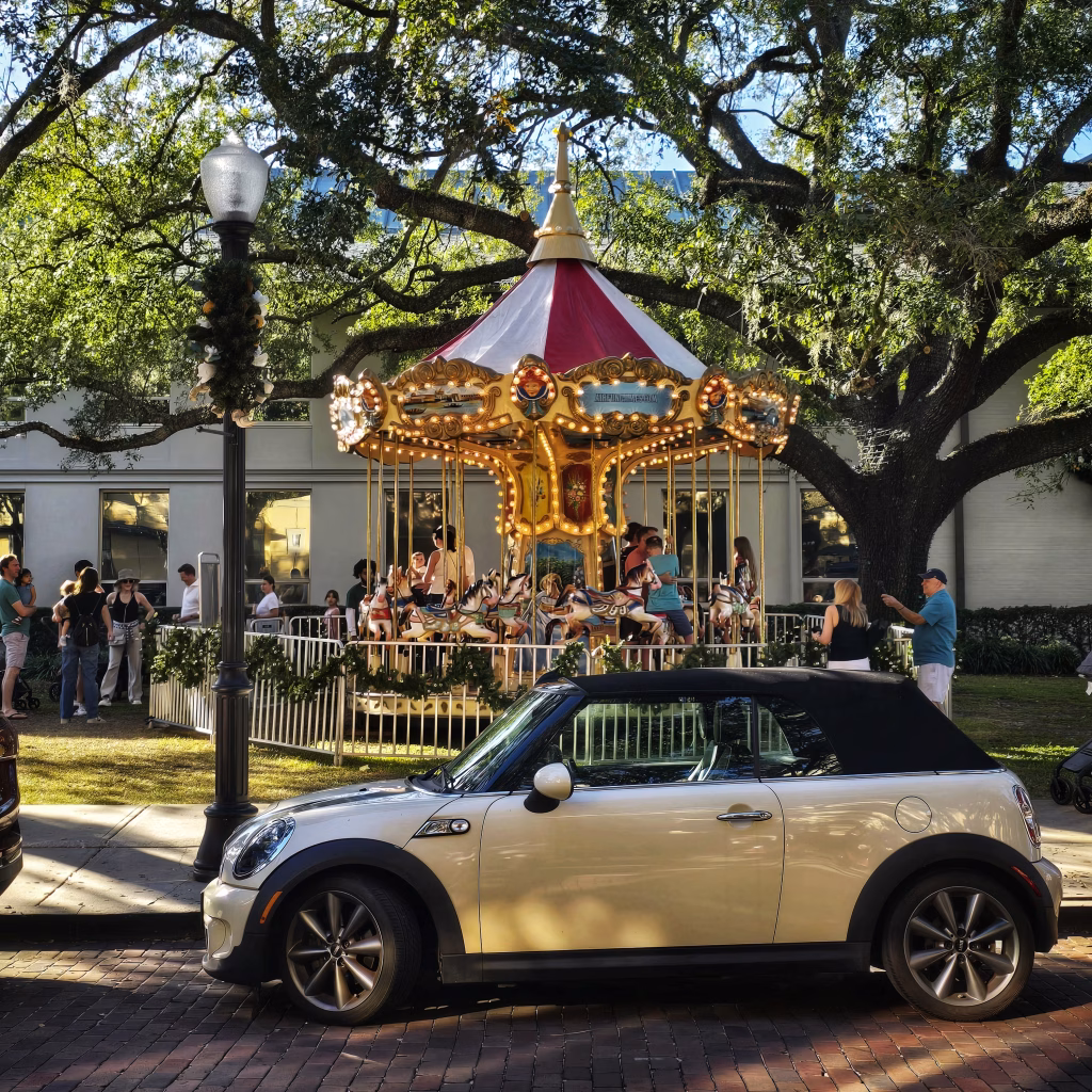 A great time to visit the carousel would be this Thursday, when The Morse Museum (Website), in cooperation with the City of Winter Park, will host its annual Christmas in the Park event in Central Park, featuring light-up Tiffany window installations, performances by the Bach Festival Choir and Brass Ensemble, and more, from 6:15 p.m. to 8:30 p.m.